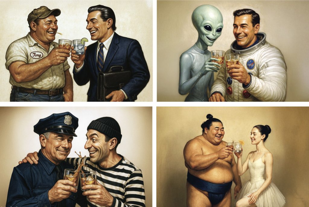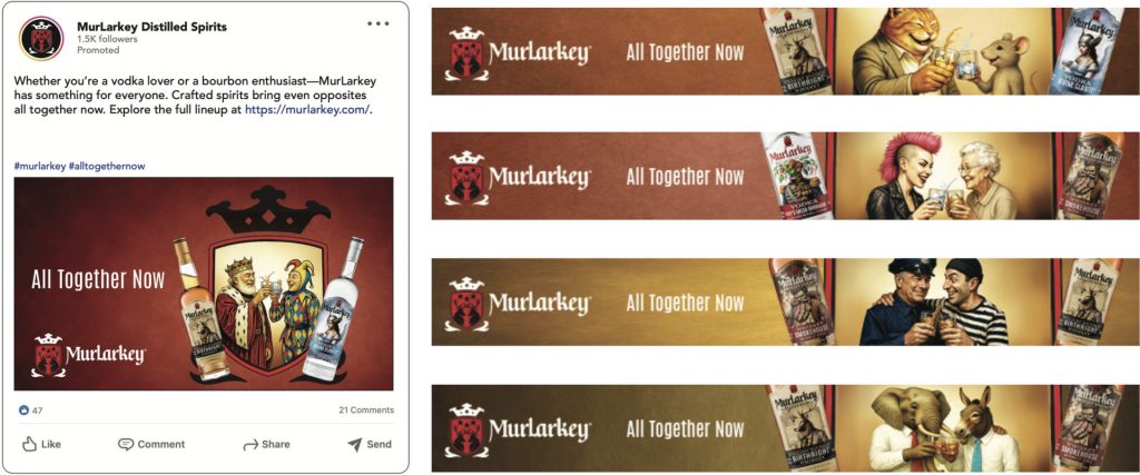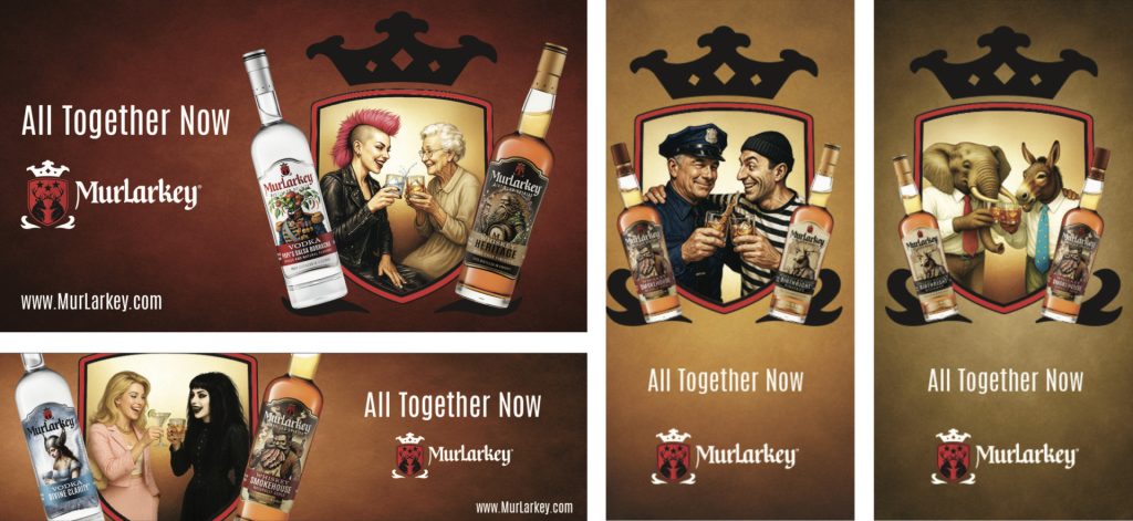 The campaign features illustrated “odd couples” locked in a MurLarkey-style crest: a cop and a robber, an alien and an astronaut, Goliath and David, Cat and Mouse, even a Republican and a Democrat – (!)smiling, raising a glass. It’s witty, visually striking, and endlessly adaptable.